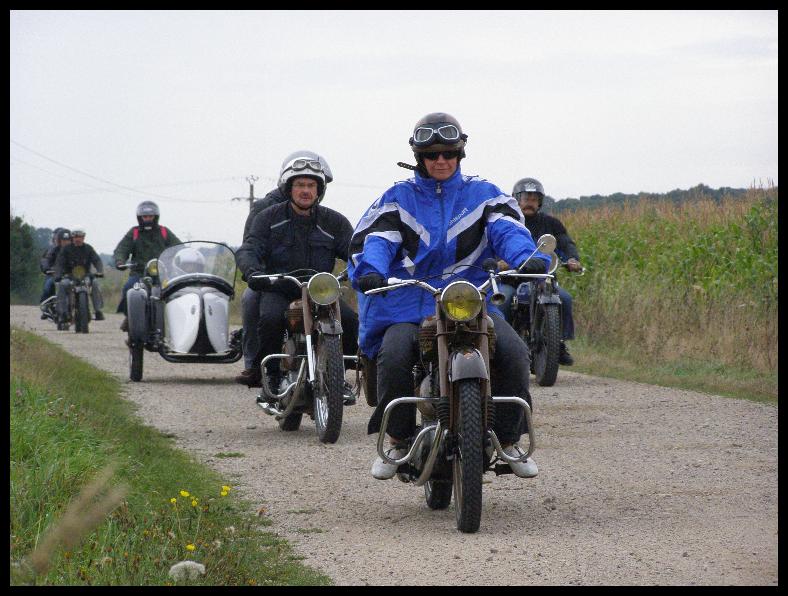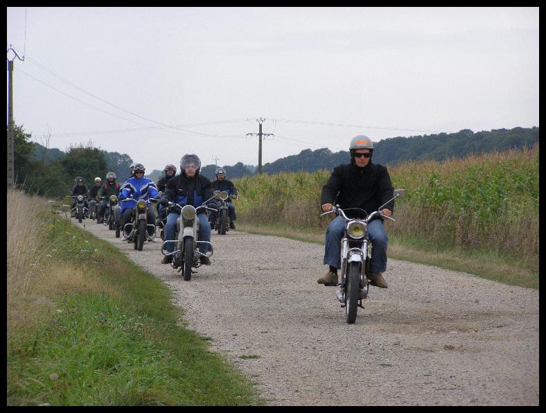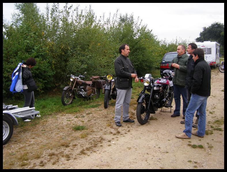 Le pique-nique annuel 2008 du Rétro Motocyclettes Sarthoises s'est déroulé le dimanche 24 août 2008. Le point de ralliement se situait au lieu dit "le Boulay" près de Teillé. Cela ne s'invente pas! Le parcours original de 70 kms prévoyait de découvrir cette merveilleuse campagne sarthoise par: Montbizot, Souligné s/s Ballon, La Trugalle, Neuville s/ Sarthe, La Bazoge, La Chapelle St Fray, Ste Sabine, St Jean D'Assé.... et retour au Boulay. En effet, l'originalité de cette année fût une invitée de dernière minute: la pluie. Comme chacun sait : La pluie du matin n'arrête pas le pèlerin ...Le plaisir de se retrouver, après la coupure des vacances, l'a emporté sur une météo plus que médiocre. Trop rincés et peu habitués à l'eau, surtout nos gosiers, une partie du parcours a été abrégée. Soulignons que l'organisation avait tout prévu. Notamment, la collecte d'objets bien identifiés comme le feu arrière et le boulon de fixation de la sacoche de la Peugeot P107 de Dominique. Remerçions particulièrement, Nicolas et son carnet d'adresses qui nous a permis de nous abriter pour le repas du midi, dans un lieu plein d'histoire de la révolution industrielle, au service des hommes et de nos terroirs. Ce passionné nous a ouvert sa collection de tracteurs, dont certains datent des années 30, des moteurs "industriels" fabuleux de la fin du 19ième siècle inventés pour répondre aux besoins des hommes. Après ce temps culturel place à l'apérot. Nos vieilles cylindrées étaient à sec. Le repas, fort sympathique, a permis à tous de se retrouver. Le cadre bien atypique, comme par exemple, dans ce lieu et sous ce hangar un moteur de paquebot de 15 tonnes, était bien propice à discussion....et pas que mécanique. Vivement l'année prochaine! Ps: Un remerciement tout particulier à l'invitation spontanée de Dominique Quantin pour clôturer cette journée.
